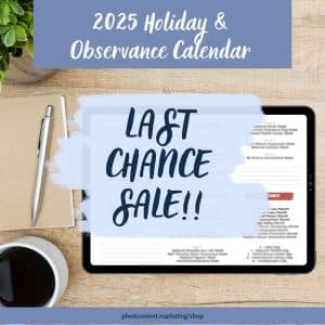 DOWNLOADABLE comprehensive 12-month content planner workbook with 450+ holidays, observances, and promotional ideas PLUS additional strategic planning tools!